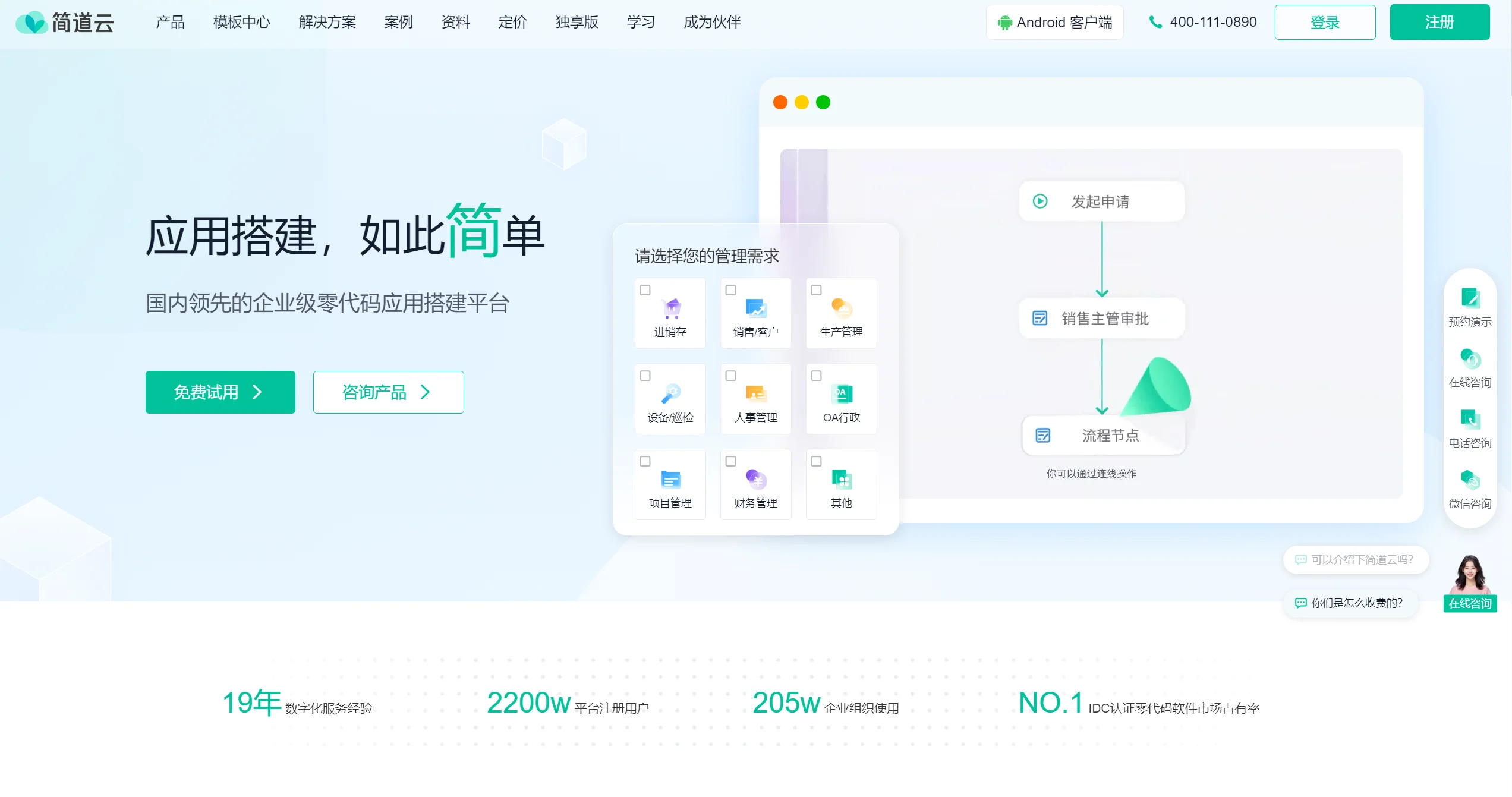 帆软软件有限公司正式推出简道云零代码应用搭建平台,标志着企业数字化转型进入零代码时代,让非技术人员也能构建专业管理系统。